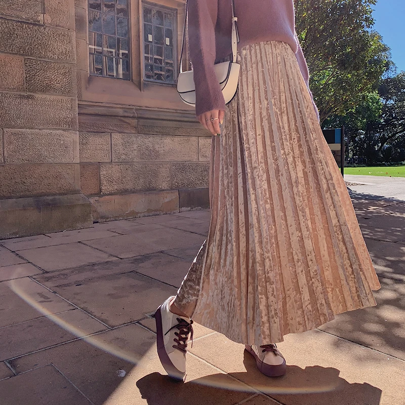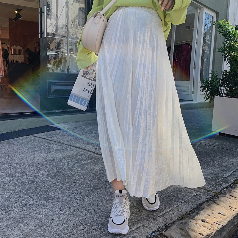 Images of 5 Colors Pleated Long Skirts for Women with Liner Korean Fashion Skirts 2020 Causal Black Skirt White Maxi Skirts :