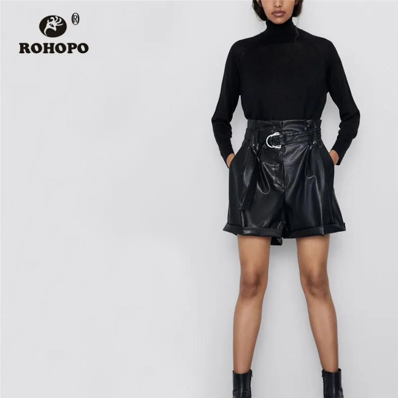 Best Offer ROHOPO High Waist PU Leather Black Skirt Shorts Metal Buckle Waistband Side Welted Pockets Leather Flared Bottom Shorts #1333