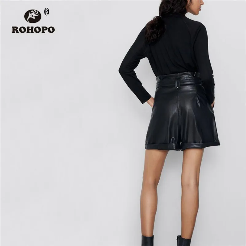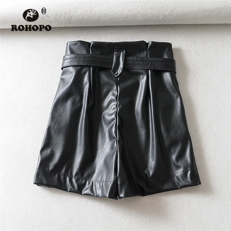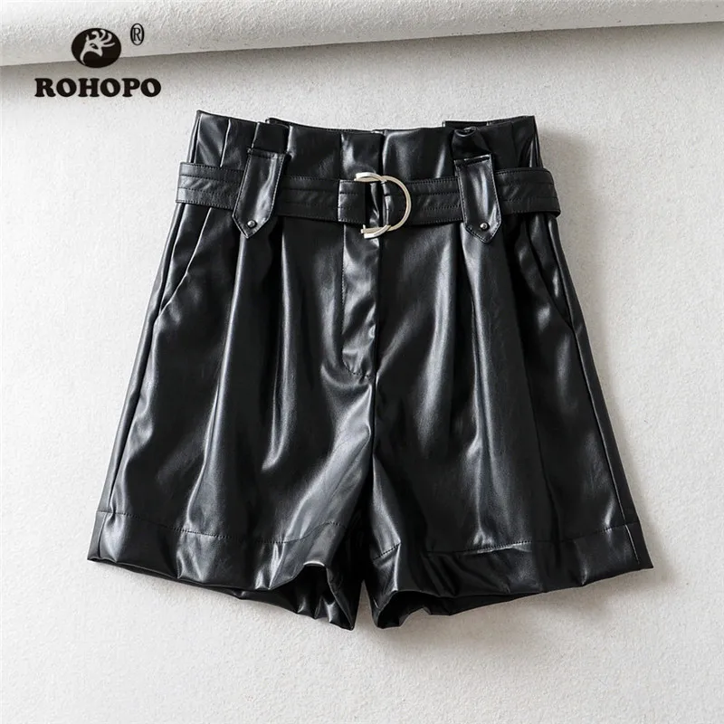 Images of ROHOPO High Waist PU Leather Black Skirt Shorts Metal Buckle Waistband Side Welted Pockets Leather Flared Bottom Shorts #1333 :