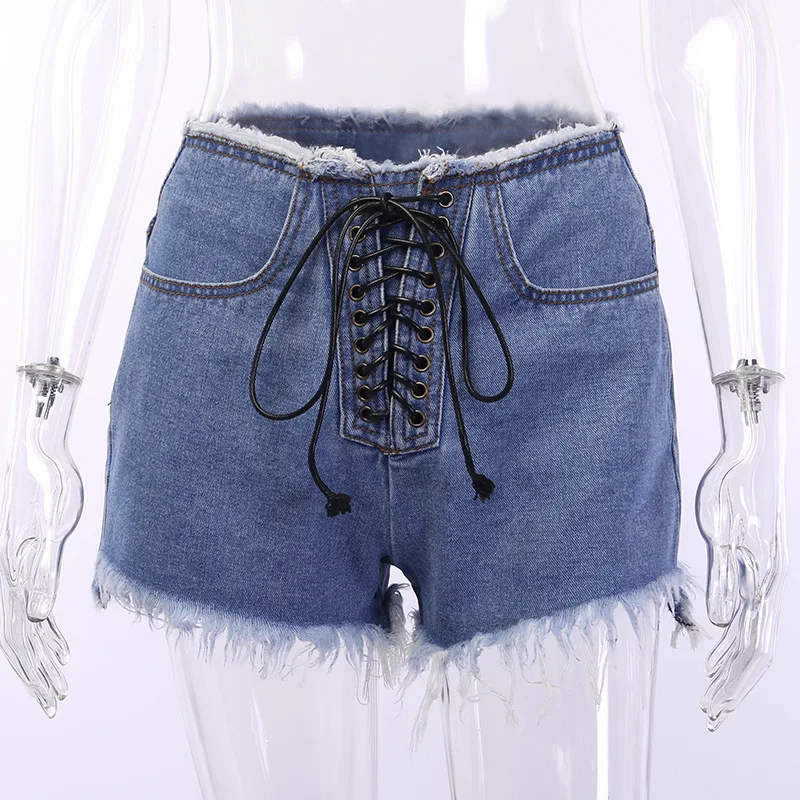 Images of Sexy Summer Women Denim Shorts High Waist Mini Hot Short Jeans Femme Tassel Lace Up Bandage Hotpants Harajuku Streetwear Shorts :