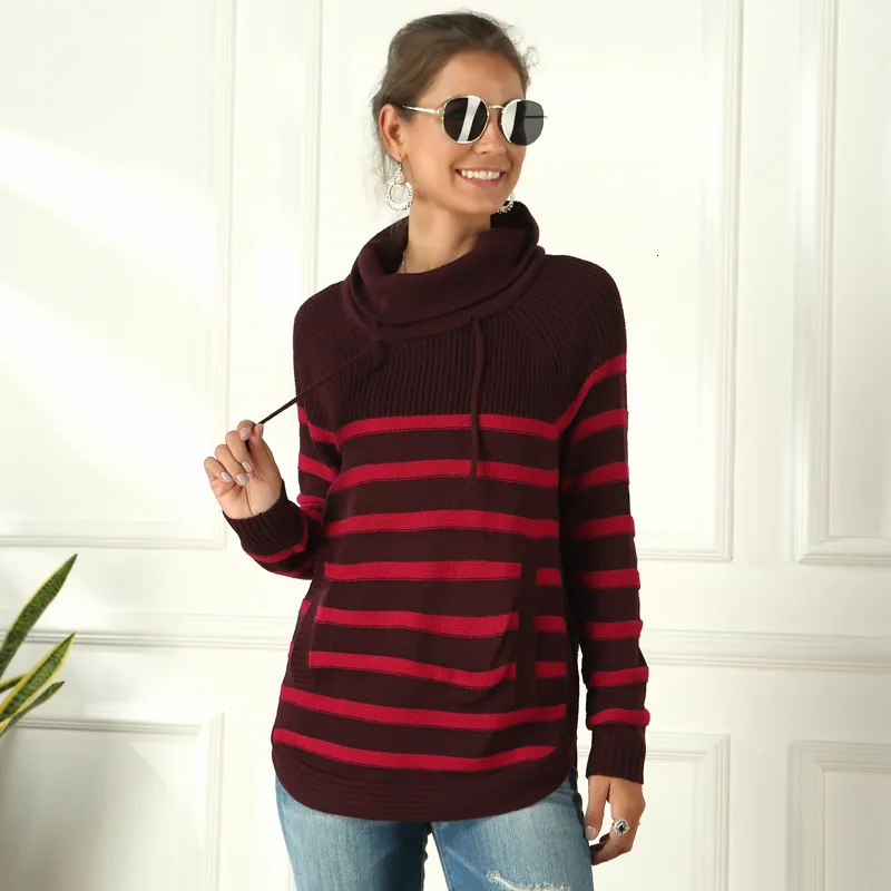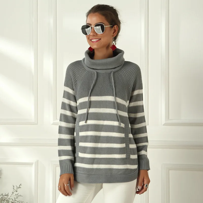 Best Offer Turtleneck Casual Striped Sweater Women Autumn Winter Knitted Ladies Jumpers Pockets Long Sleeve Female Pullovers Jersey Mujer