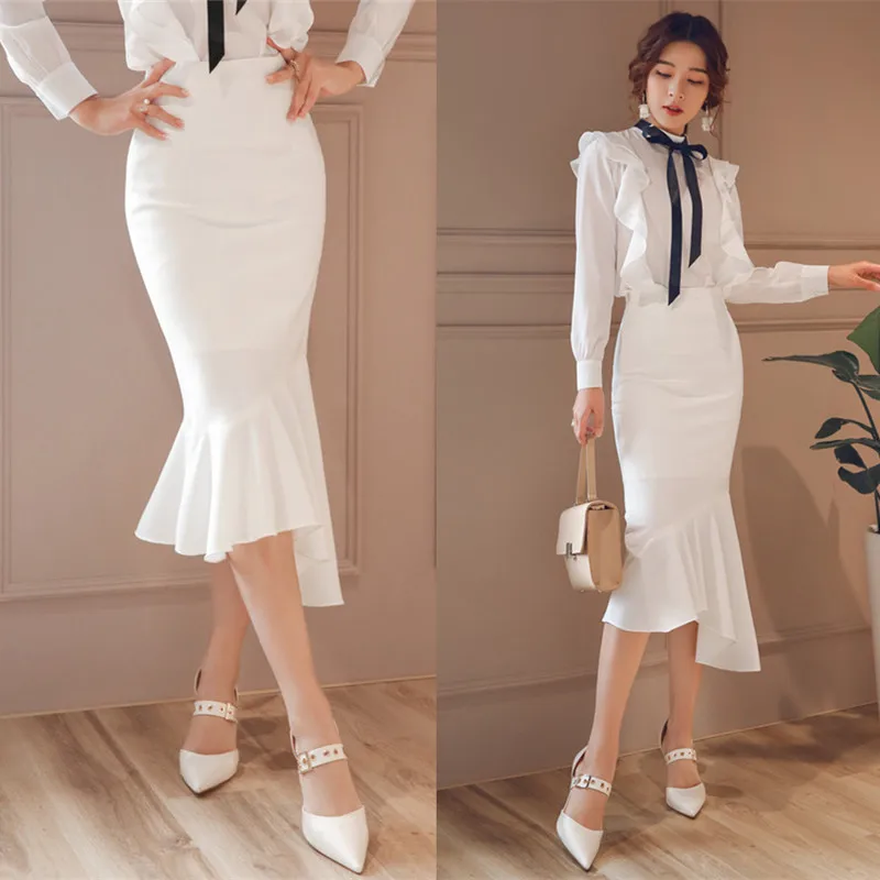 New Free Shipping 2019 New Fashion Long Mid-calf Skirt For Women Plus Size XS-3XL Mermaid Style Stretch Ladies Black And White Skirt