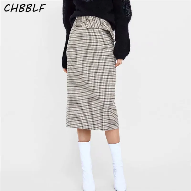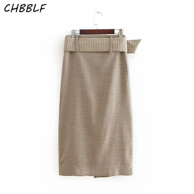 Promo CHBBLF women basic plaid midi skirt split faldas mujer Houndstooth pattern office lady casual sashes skirts BGB8538