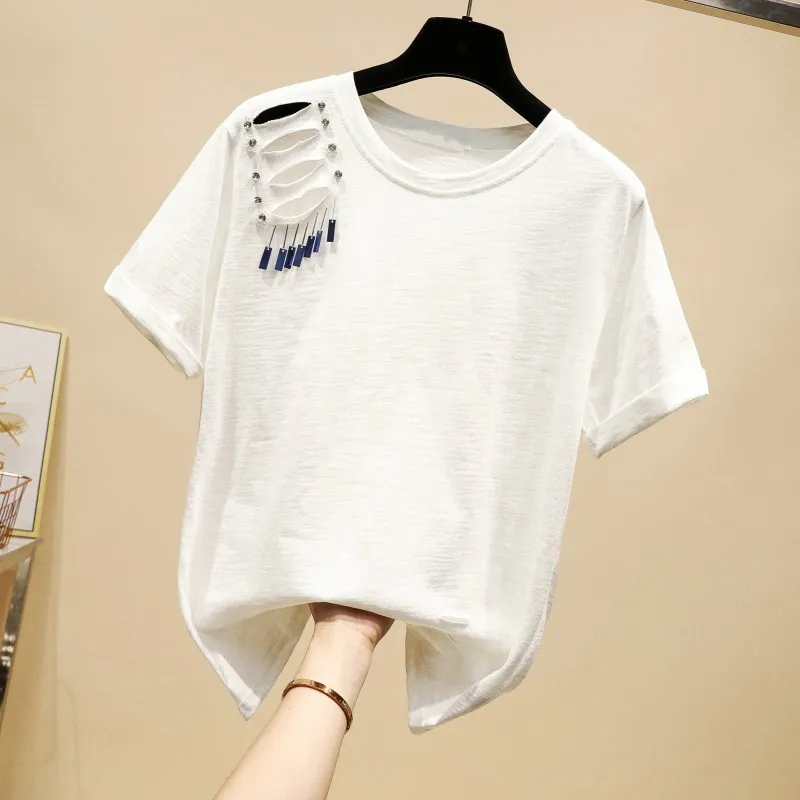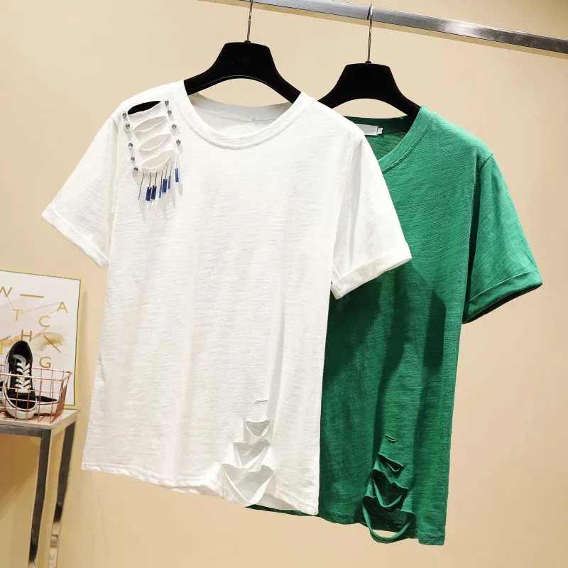 Images of 2020 Spring Summer New Korean Fashion Solid Color Sequined Ripped Slub Cotton Round Neck Short Sleeve T-shirt Women's Casual Top :