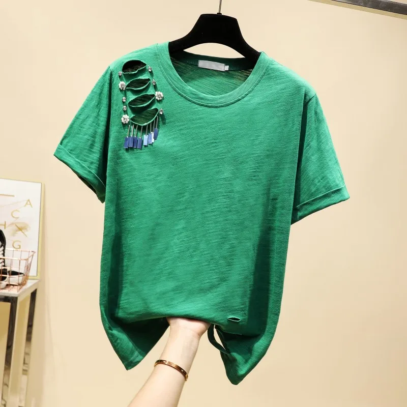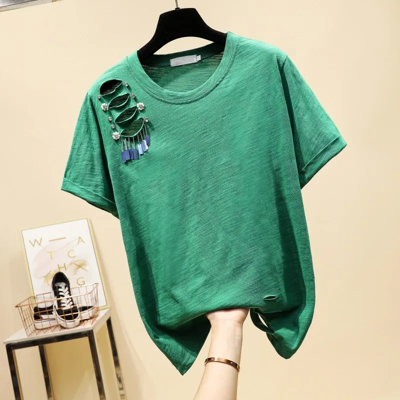 Get this 2020 Spring Summer New Korean Fashion Solid Color Sequined Ripped Slub Cotton Round Neck Short Sleeve T-shirt Women's Casual Top with limited time discount by pressing the button below