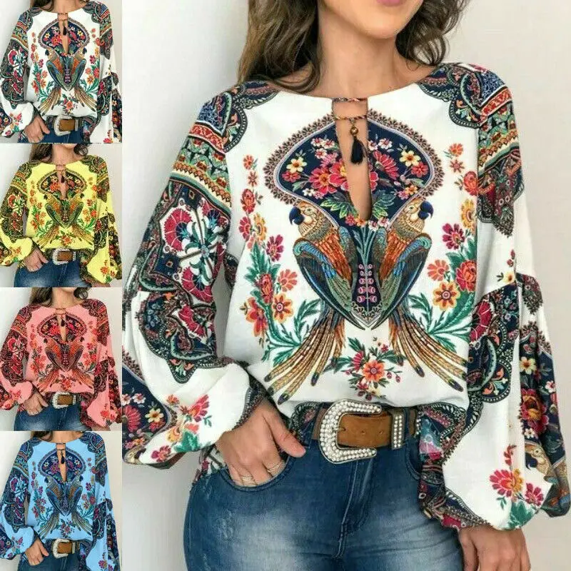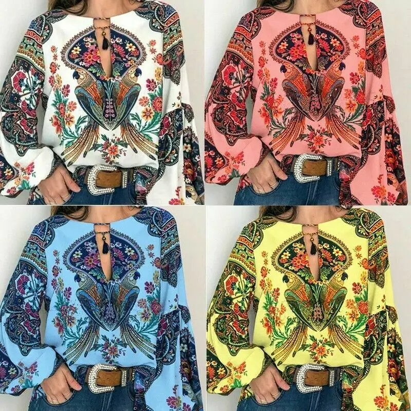 Get this 2020 Women Boho Floral Print O-Neck Long Lantern Sleeve Oversize T-Shirt Tops S-3XL Elegant Female Summer Tops Loose with limited time discount by pressing the button below